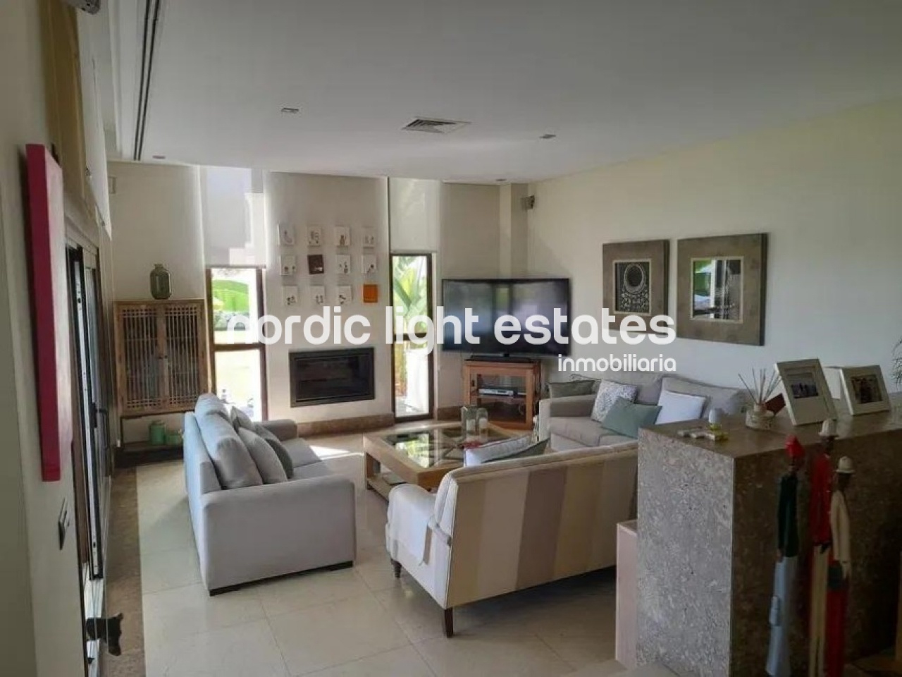 The property includes six bedrooms with fitted wardrobes, five bathrooms, and a spectacular living and dining room with multiple areas and direct access to the private garden featuring a stunning exclusive swimming pool