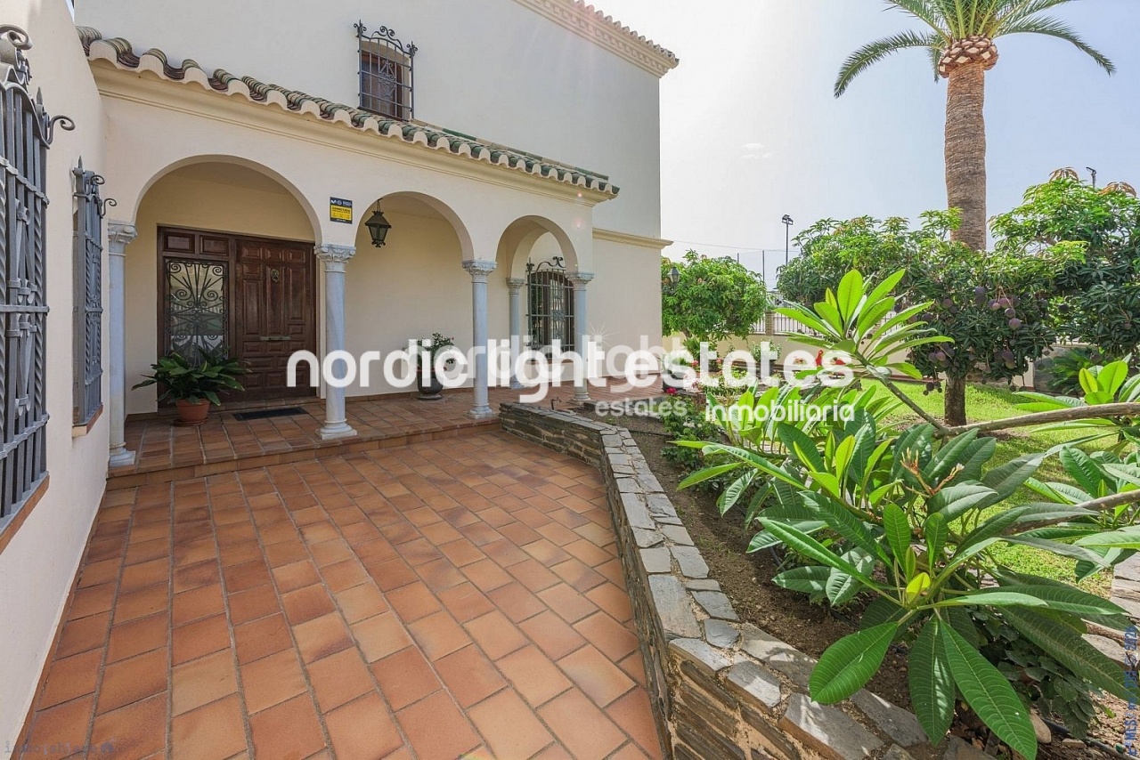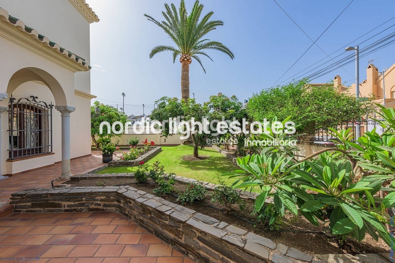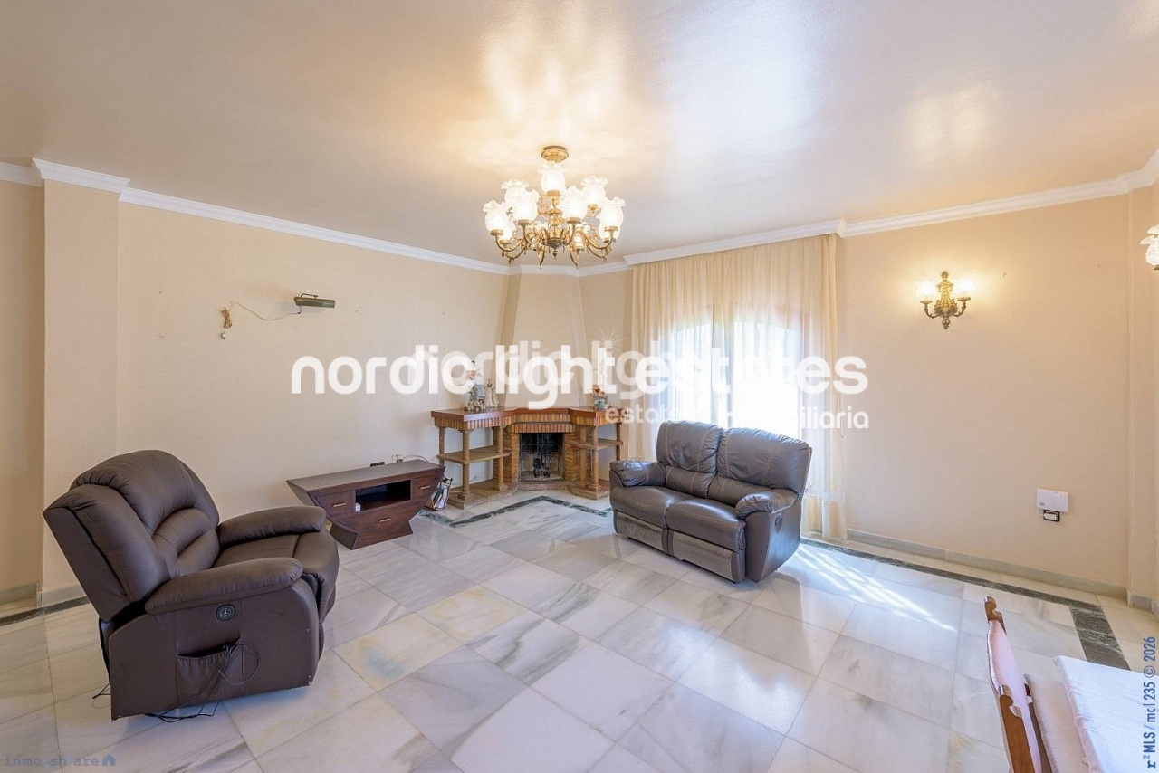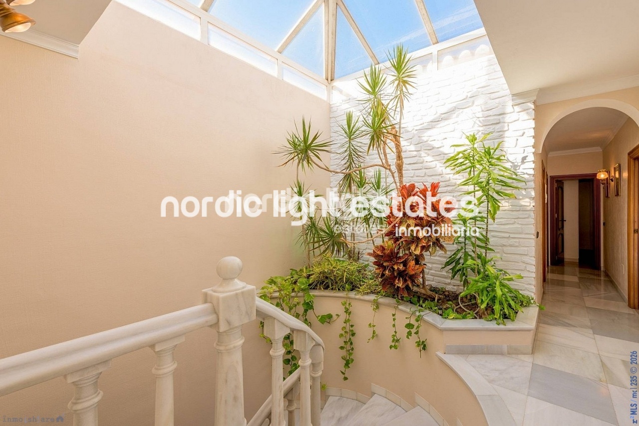 Construida en los años 80 por un arquitecto y constructor local reconocido, sobre una parcela de esquina de 700 m², la vivienda ofrece 370 m² construidos más garaje doble de 44 m². La propiedad destaca por sus materiales nobles, como suelos de mármol de Macael, carpintería de maderas artesanales, cerámica andaluza en zonas frescas y ventanales con rejería artística de forja. Una cúpula de vidrio interior aporta luz natural a los espacios principales.