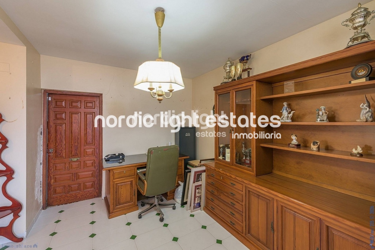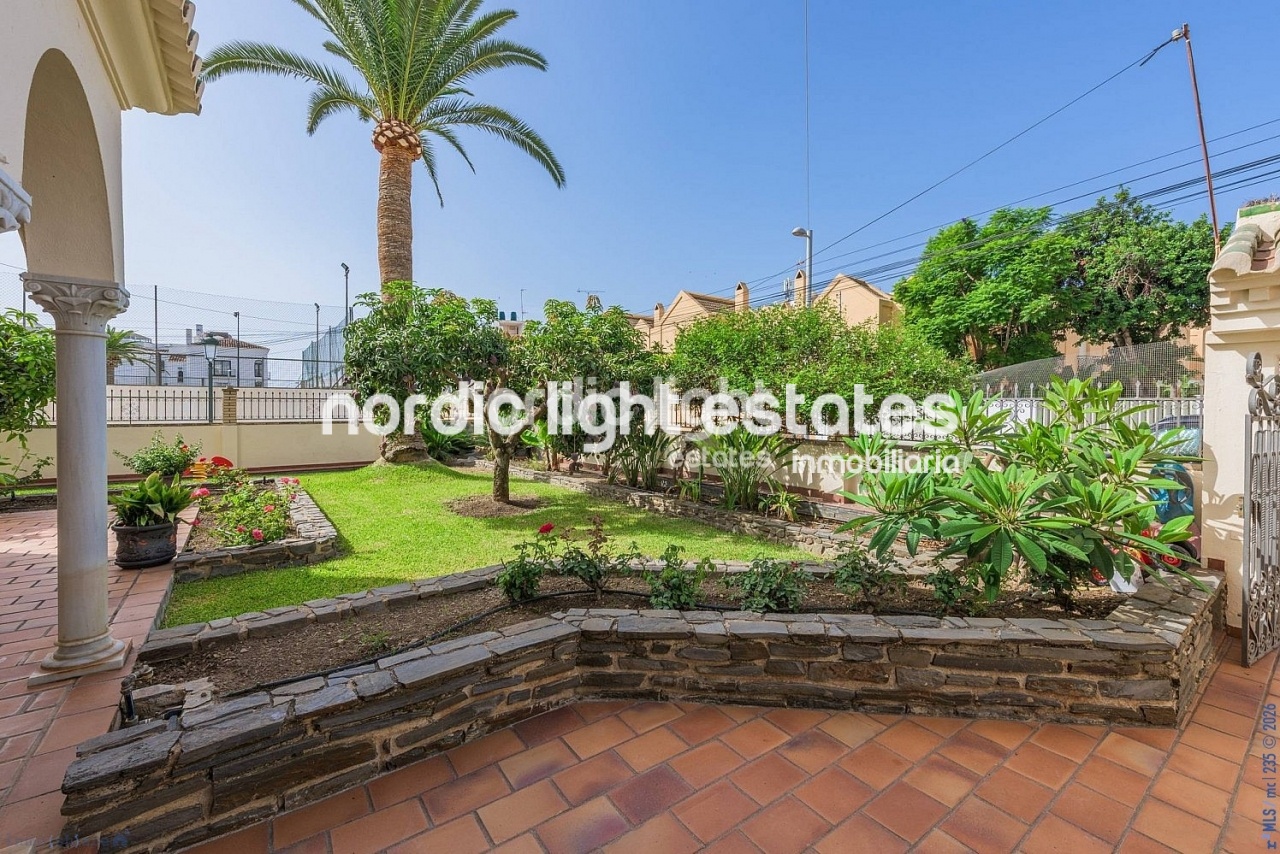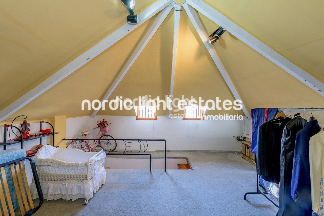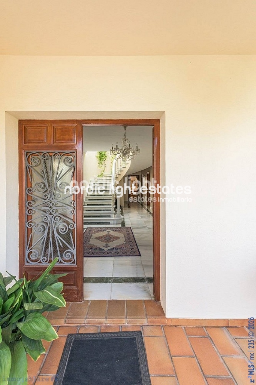 Construida en los años 80 por un arquitecto y constructor local reconocido, sobre una parcela de esquina de 700 m², la vivienda ofrece 370 m² construidos más garaje doble de 44 m². La propiedad destaca por sus materiales nobles, como suelos de mármol de Macael, carpintería de maderas artesanales, cerámica andaluza en zonas frescas y ventanales con rejería artística de forja. Una cúpula de vidrio interior aporta luz natural a los espacios principales.