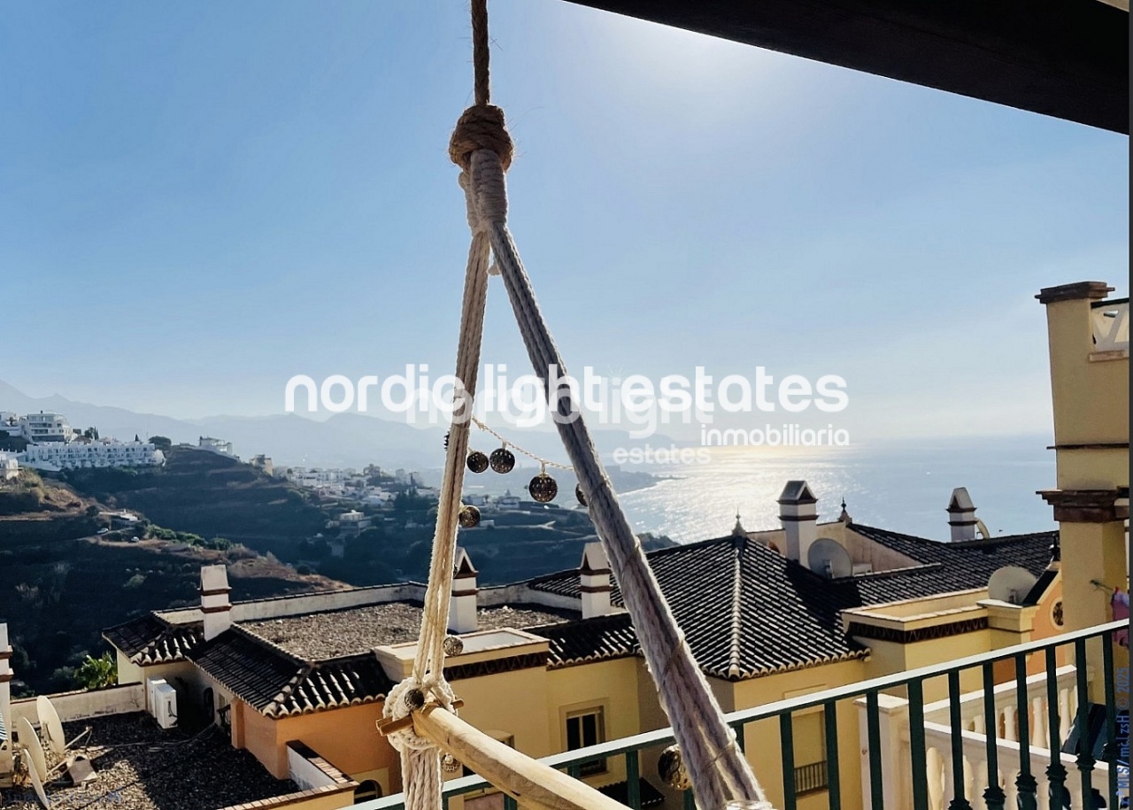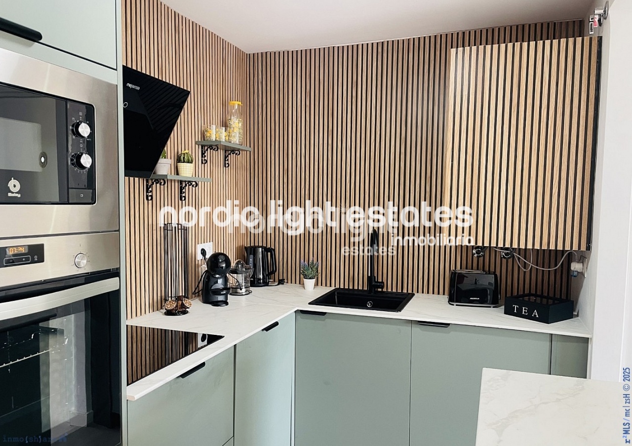 El salón, amplio y luminoso, se abre a una impresionante terraza con vistas panorámicas al mar y a la montaña, un espacio perfecto para relajarse, disfrutar de la brisa marina o compartir momentos con invitados. La cocina de diseño, equipada con electrodomésticos de última generación y una elegante isla central, convierte cada comida en una experiencia gourmet.