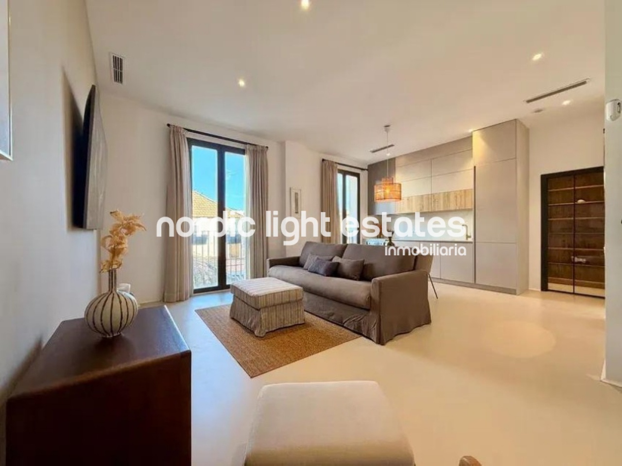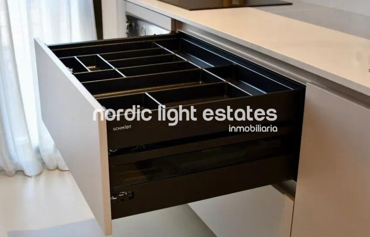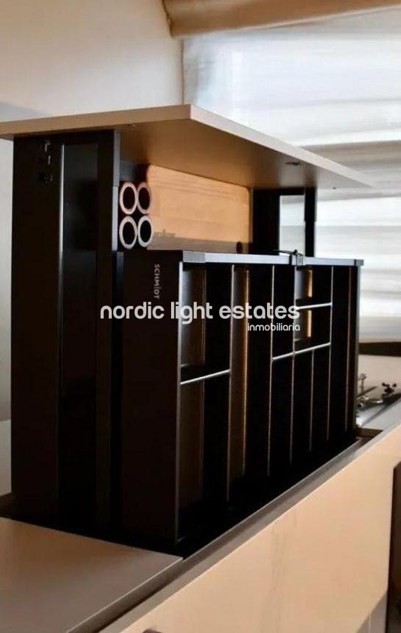 La vivienda dispone de un luminoso salón con cocina integrada, concebido como un espacio moderno y funcional. La cocina está equipada con mobiliario a medida de gran capacidad, diseñado cuidadosamente para maximizar el almacenamiento sin renunciar a una estética elegante y minimalista.