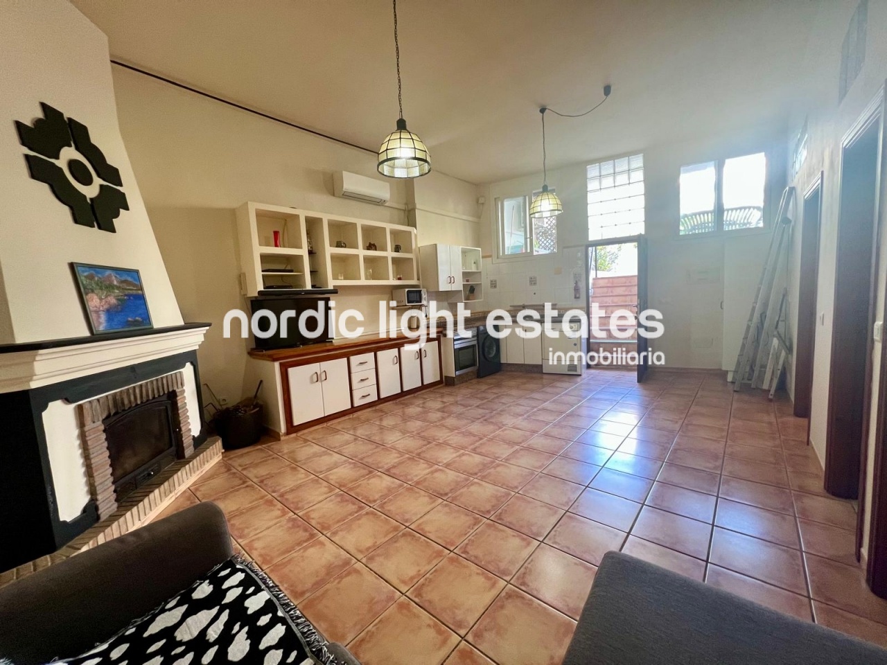 La vivienda dispone de dos dormitorios, un baño con ducha, y un gran salón de concepto abierto con cocina americana totalmente equipada y chimenea, creando un ambiente cálido y acogedor.