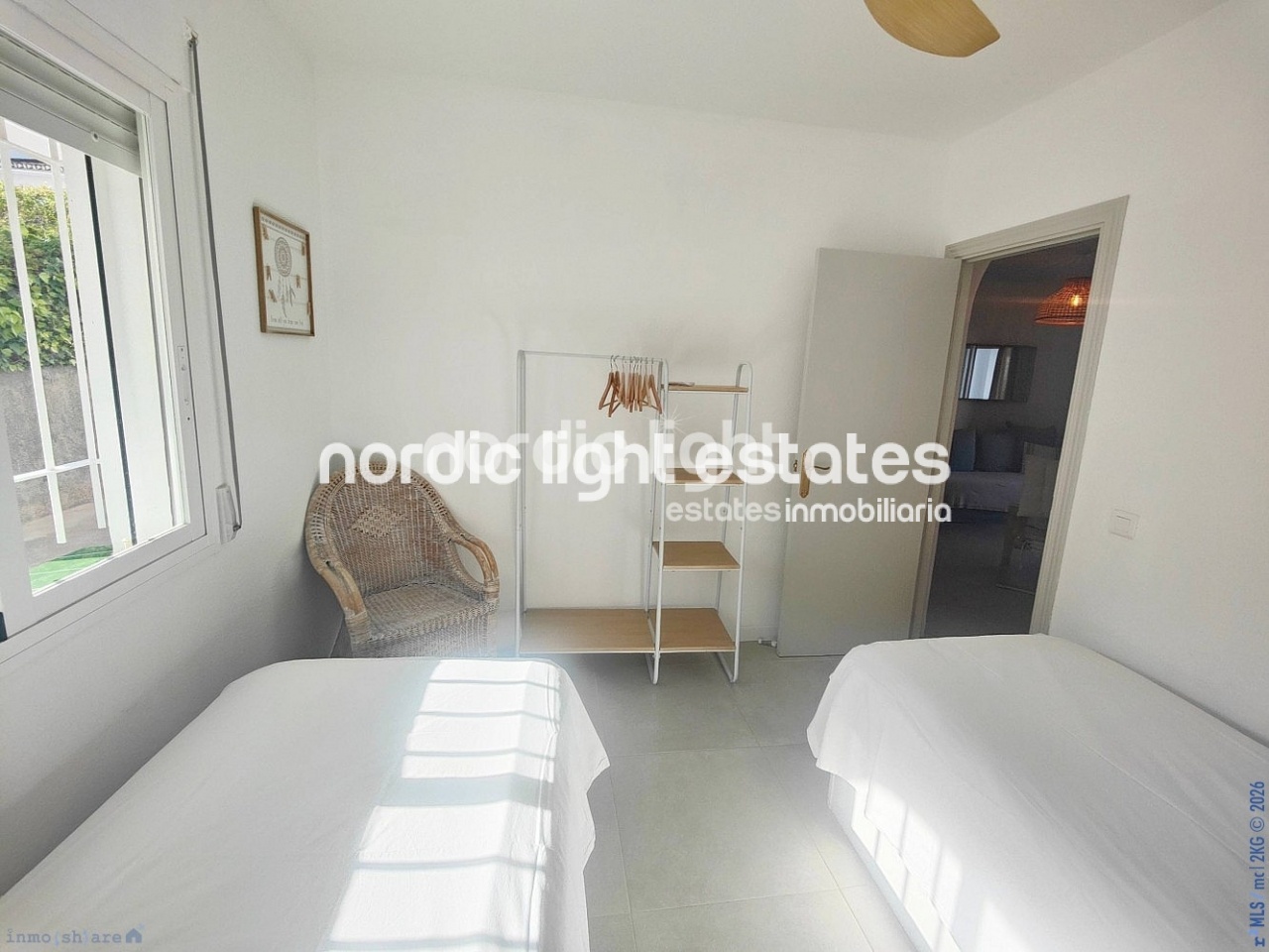 La vivienda dispone de dos amplios dormitorios, uno doble y otro con dos camas, ambos con armarios empotrados y aire acondicionado, garantizando confort durante todo el año. Comparten un moderno baño con ducha de diseño contemporáneo.
